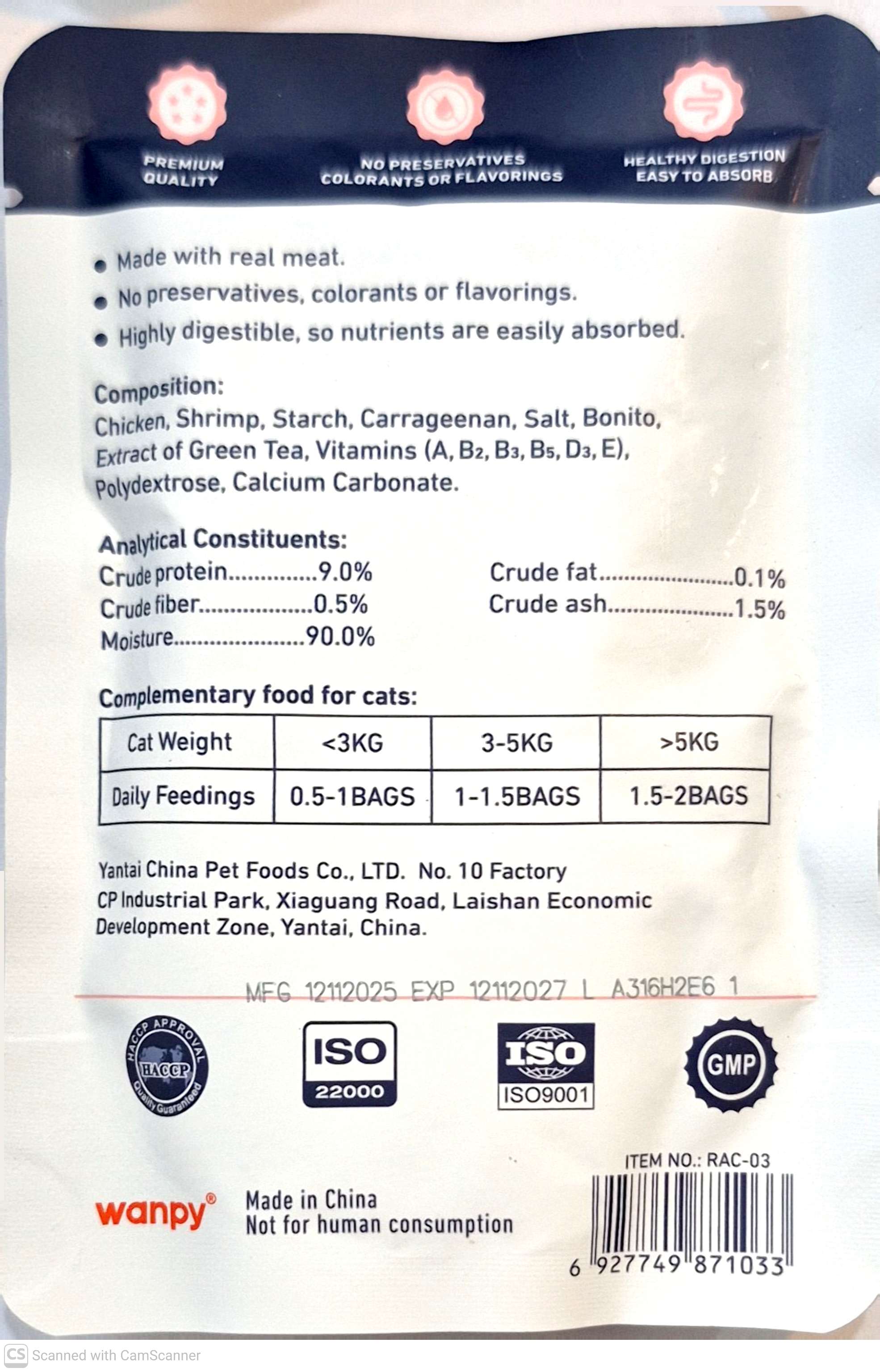 مواد تشکیل دهنده:سینه مرغ ریش ریش شده، میگو، نشاسته، ماهی بونیتو، عصاره درخت چای، ویتامین ها (A، B2، B3، B5، D3، E)،کلسیم کربنات.